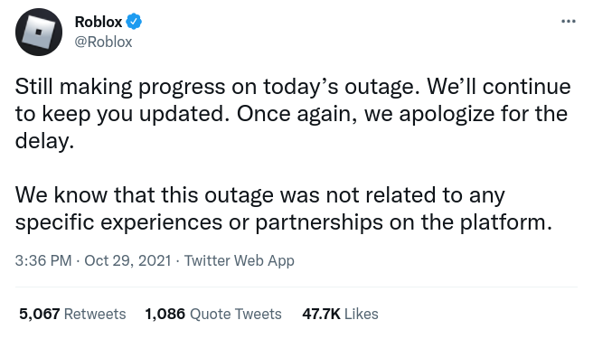 ROBLOX is down and millions of players have been turfed out of the game but you can find out when its back online instantly. In fact the official twitter account has cleared up this rumor by tweeting that it is a hoax. Roblox is said to have gone down at around 4am IST on October 29 2021 according to complaints on Twitter.